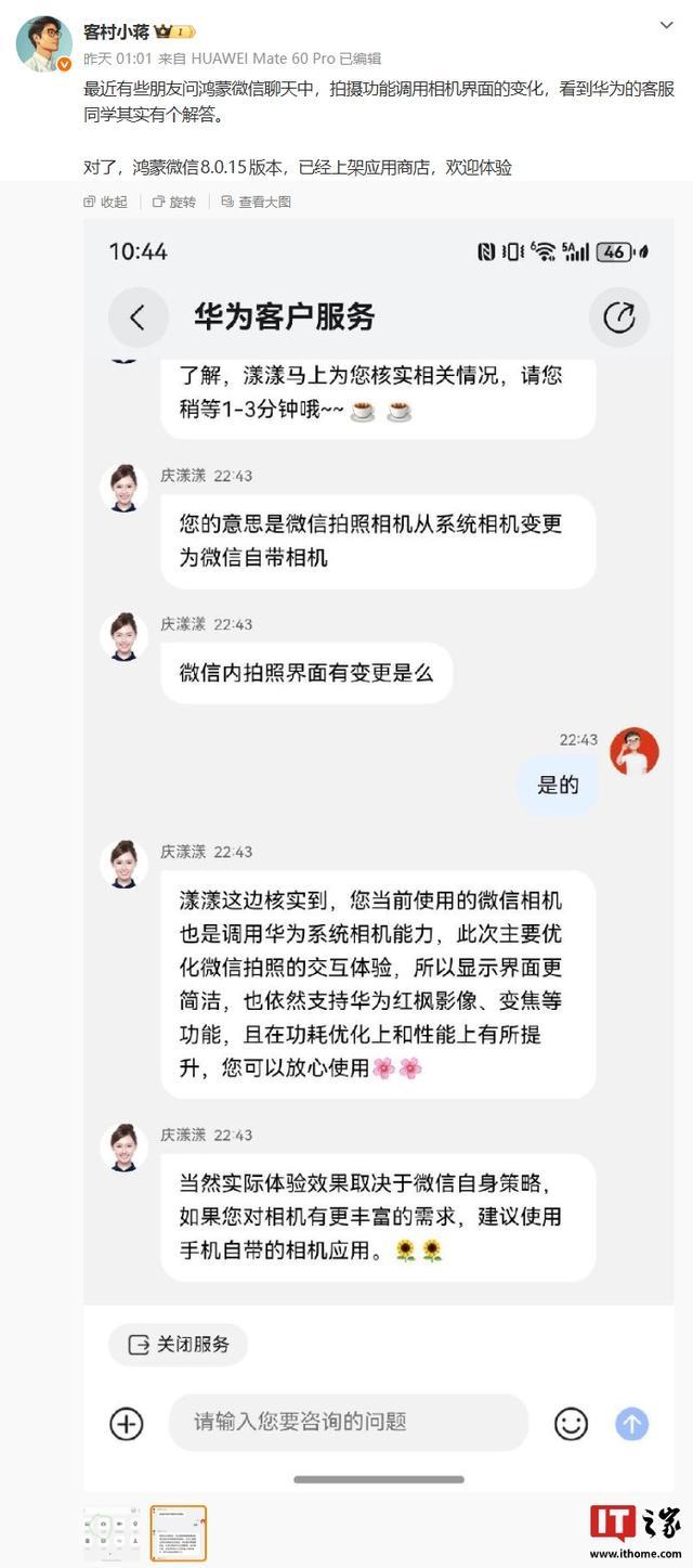 IT之家注意到,微信员工 @客村小蒋 昨日发文提及了该变化,并分享了华为客户服务的解答: