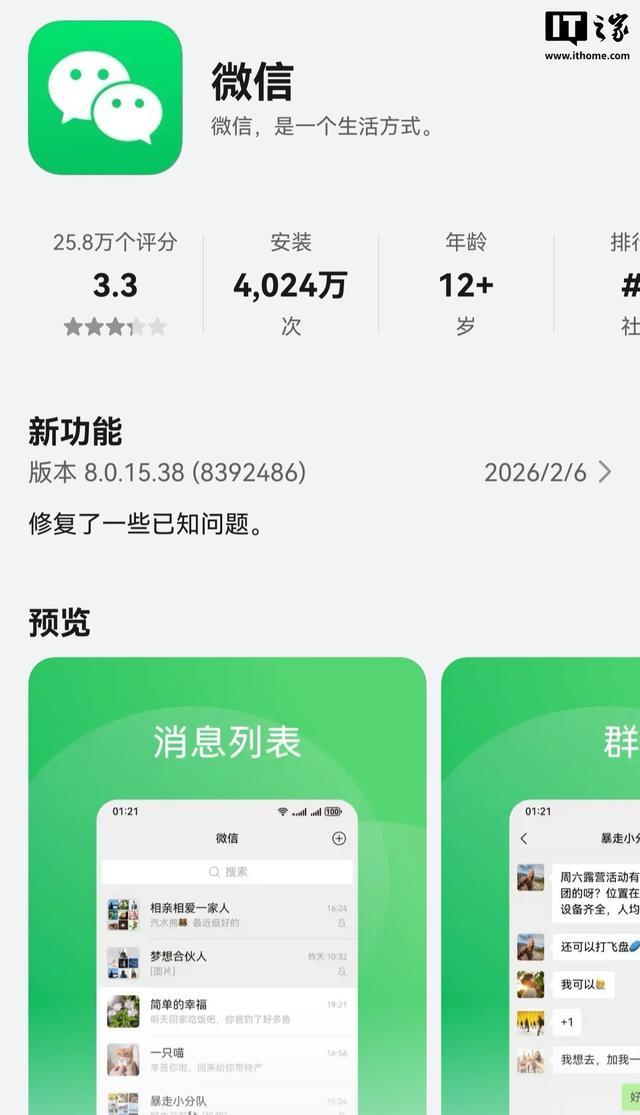 微信鸿蒙版 App 已于 2 月 6 日在华为应用市场(App Gallery)发布了 8.0.15.38 正式版更新,更新日志依然是“修复了一些已知问题”,相较上一个正式版补齐 20 余项功能。