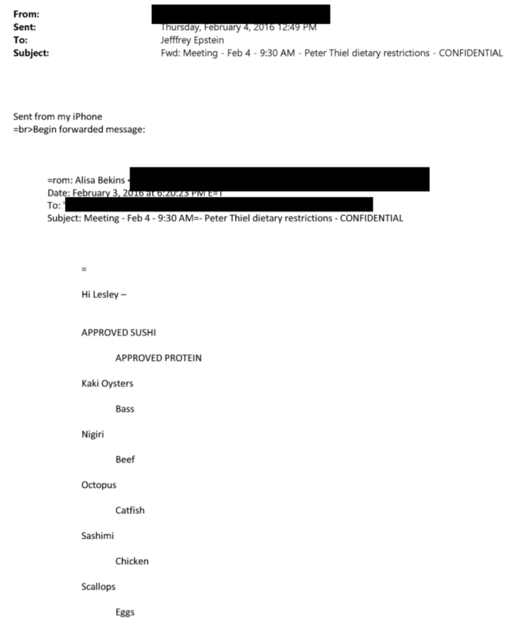 有趣的是,Thiel的助手曾向爱泼斯坦发送了一份详尽的「饮食禁忌单」,要求避开乳制品和麸质。