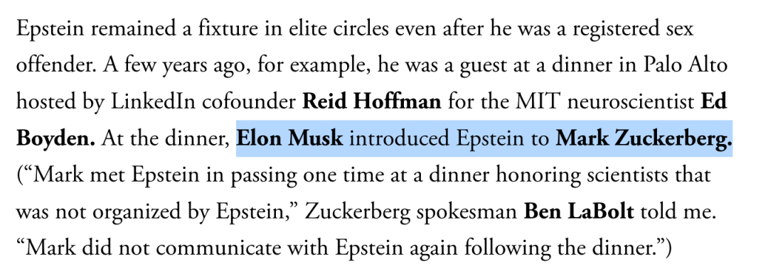 《名利场》文中爆料:就在那场宴会上,马斯克将小扎介绍给了爱泼斯坦。