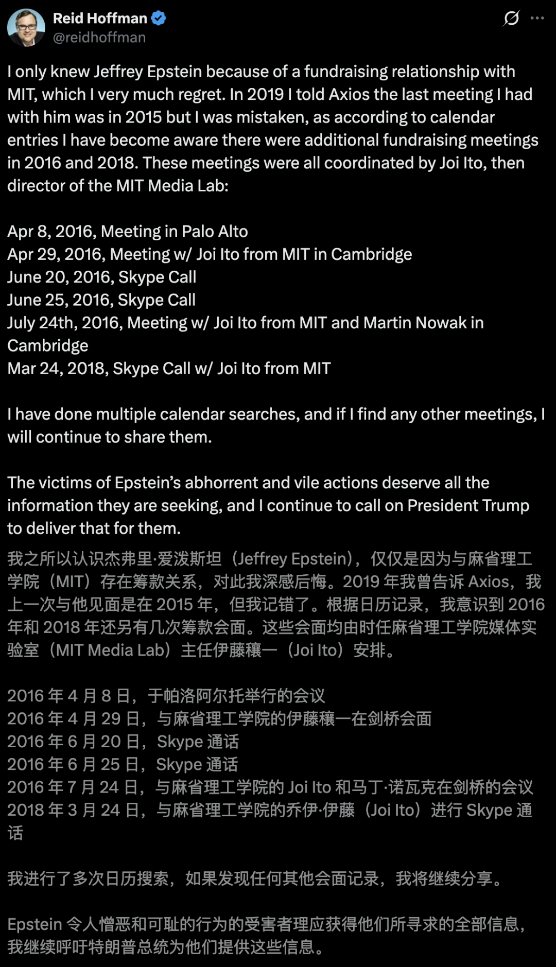 几天前,Hoffman曾公开「认错」,称参与爱泼斯坦的慈善筹款,是为了支持MIT媒体实验室。