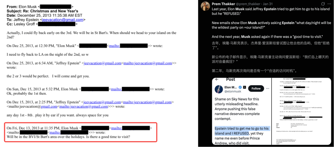 尽管马斯克坚称从未登岛,但邮件显示他在2012年曾询问爱泼斯坦「岛上的派对哪晚最疯狂」。