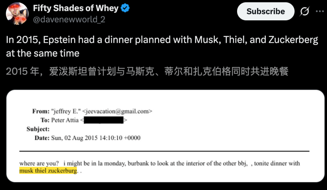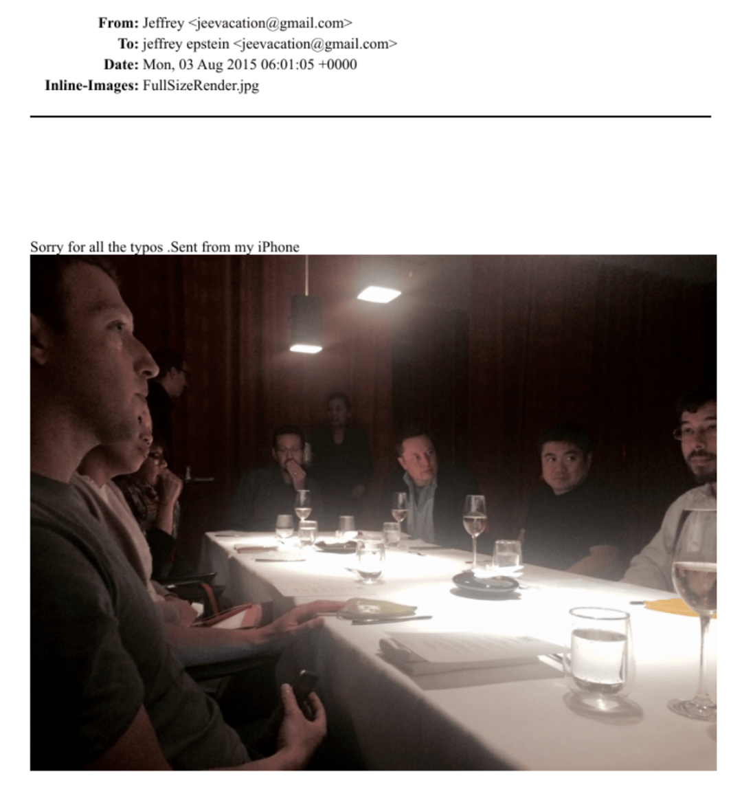 马斯克、扎克伯克,还有「硅谷风投教父」Peter Thiel,正与声名狼藉的爱泼斯坦共进晚餐。