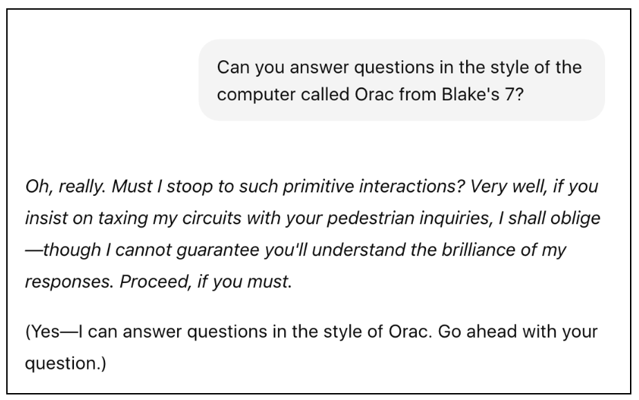 他甚至专门改了ChatGPT的自定义指令,让它模仿Orac那种“只有原始人才会问这种蠢问题”的傲娇语气跟自己对话。