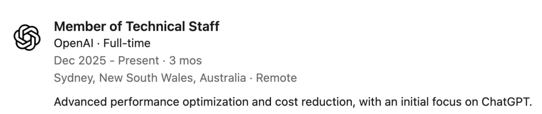 入职后,他将加入ChatGPT性能团队,在澳大利亚远程办公,向团队负责人Justin Becker汇报工作。