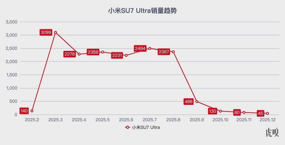 从2025年9月起,小米SU7Ultra月销量暴跌,直至去年12月份,从最高峰月销三千多辆,下滑到月销只有45辆。