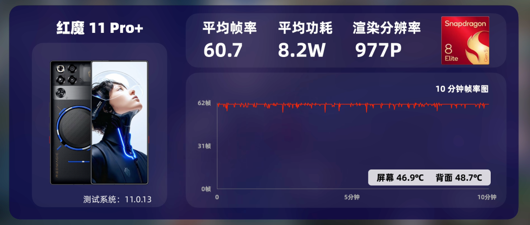 即便是机哥搬出了星铁里最极限的测试,平均功耗干到 8.2W,红魔 11 Pro+ 的帧率依然稳如老狗。