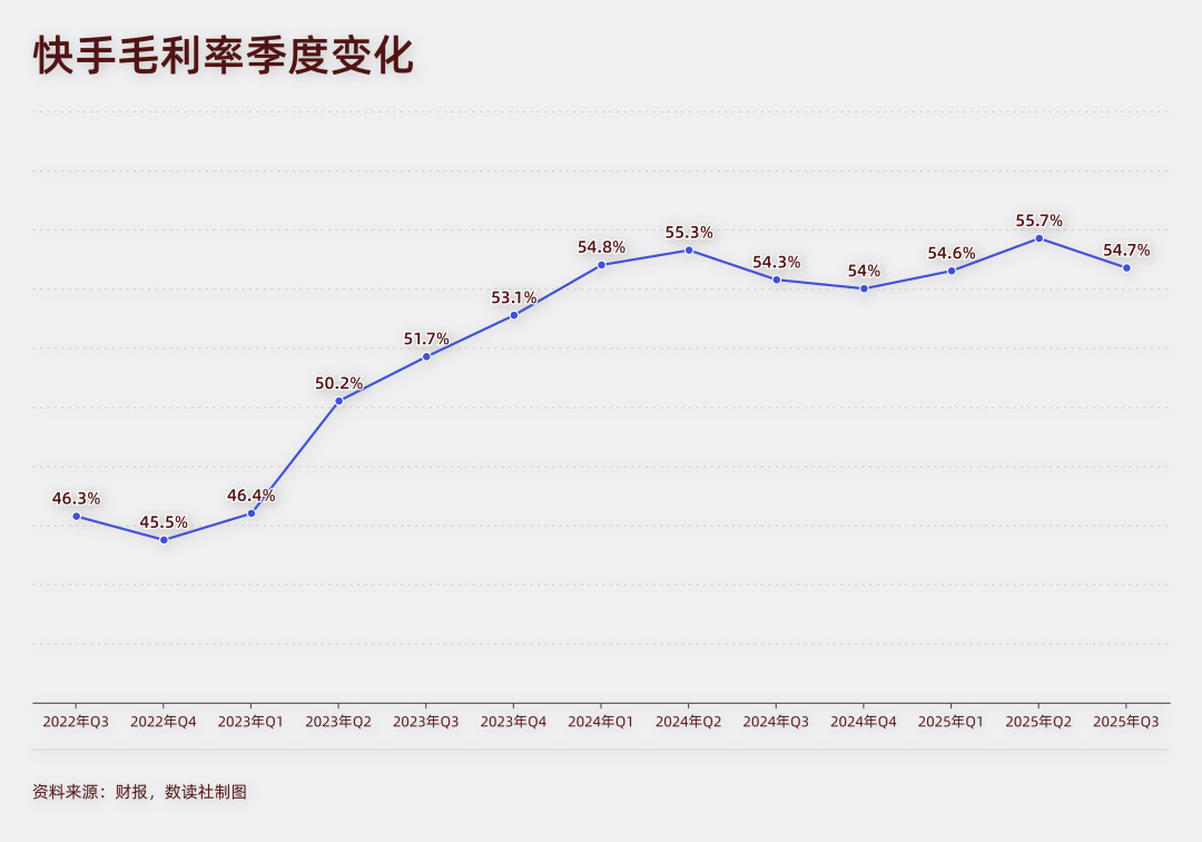 2023年、2024年,快手毛利率超过50%,这样的势头延续到2025年,三季度毛利率为54.7%。而在2022年,快手的毛利率只有44.7%。