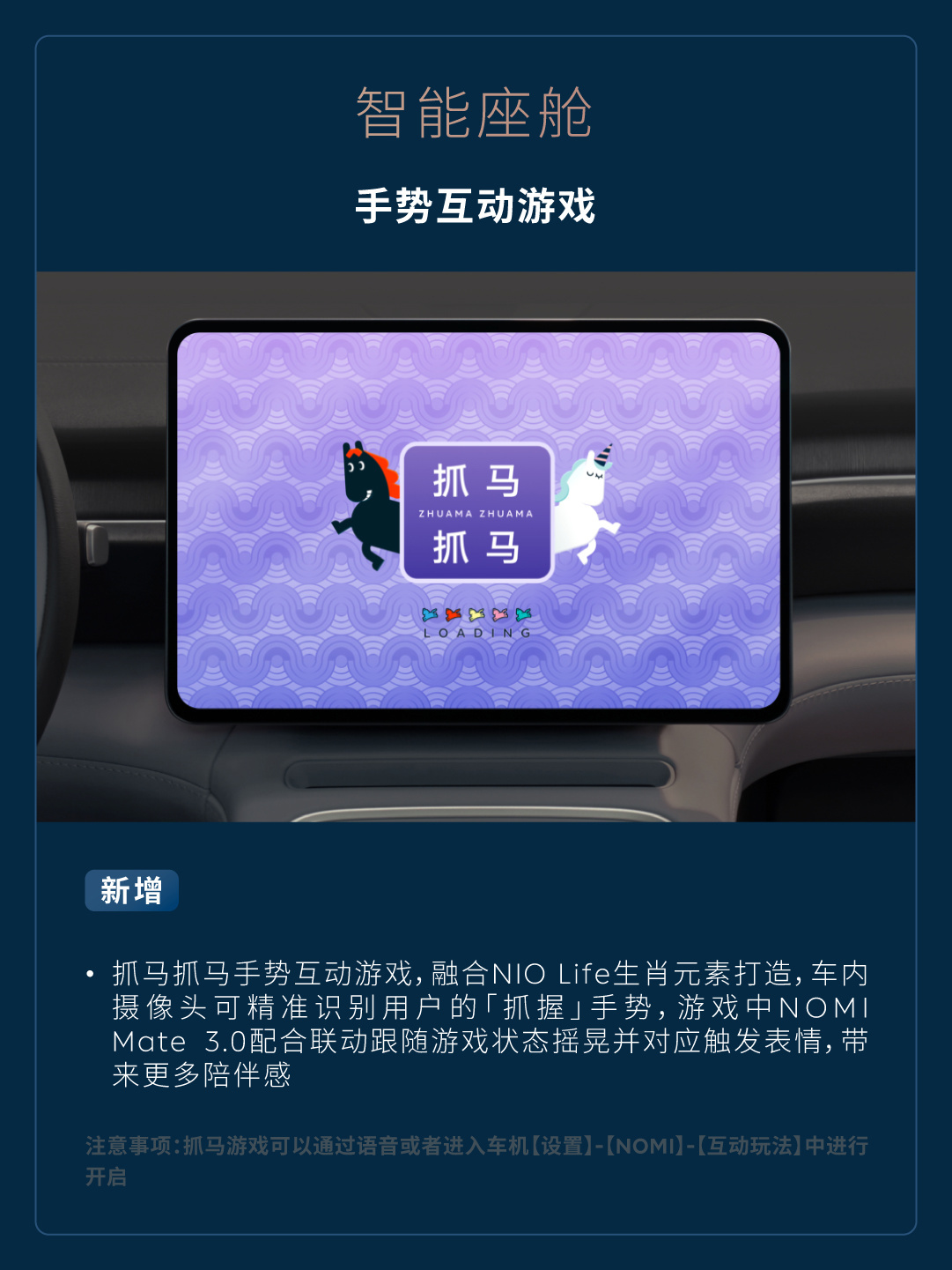 抓马抓马手势互动游戏,融合 NIO Life 生肖元素打造,车内摄像头可精准识别用户的「抓握」手势,游戏中 NOMI Mate 3.0 配合联动跟随游戏状态摇晃并对应触发表情,带来更多陪伴感(注意事项:抓马游戏可以通过语音或者进入车机【设置】-【NOMI】-【互动玩法】中进行开启)。
