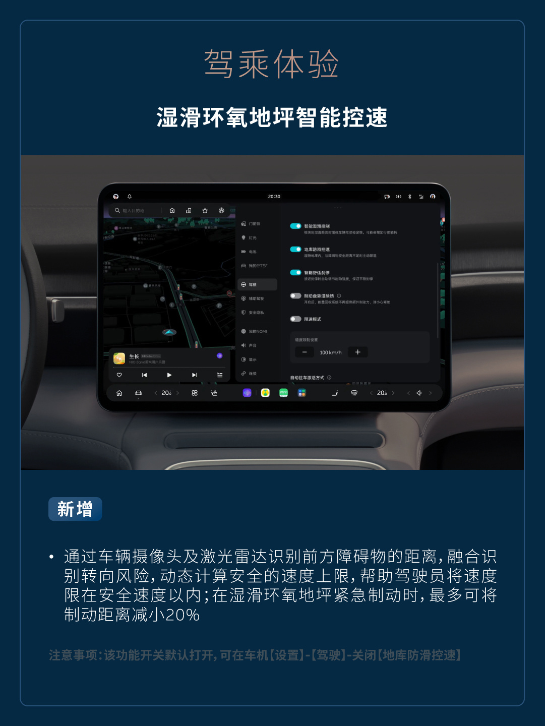 新增通过车辆摄像头及激光雷达识别前方障碍物的距离,融合识别转向风险,动态计算安全的速度上限,帮助驾驶员将速度限在安全速度以内;在湿滑环氧地坪紧急制动时,最多可将制动距离减小 20%(注意事项:该功能开关默认打开,可在车机【设置】-【驾驶】- 关闭【地库防滑控速】)。