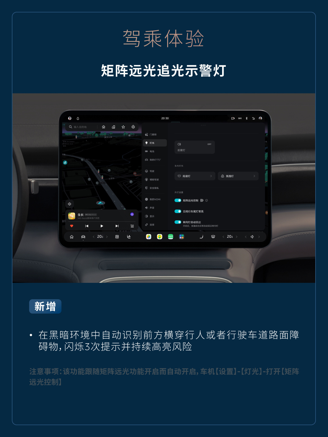 在黑暗环境中自动识别前方横穿行人或者行驶车道路面障碍物,闪烁 3 次提示并持续高亮风险(注意事项:该功能跟随矩阵远光功能开启而自动开启,车机【设置】-【灯光】-打开【矩阵远光控制】)。