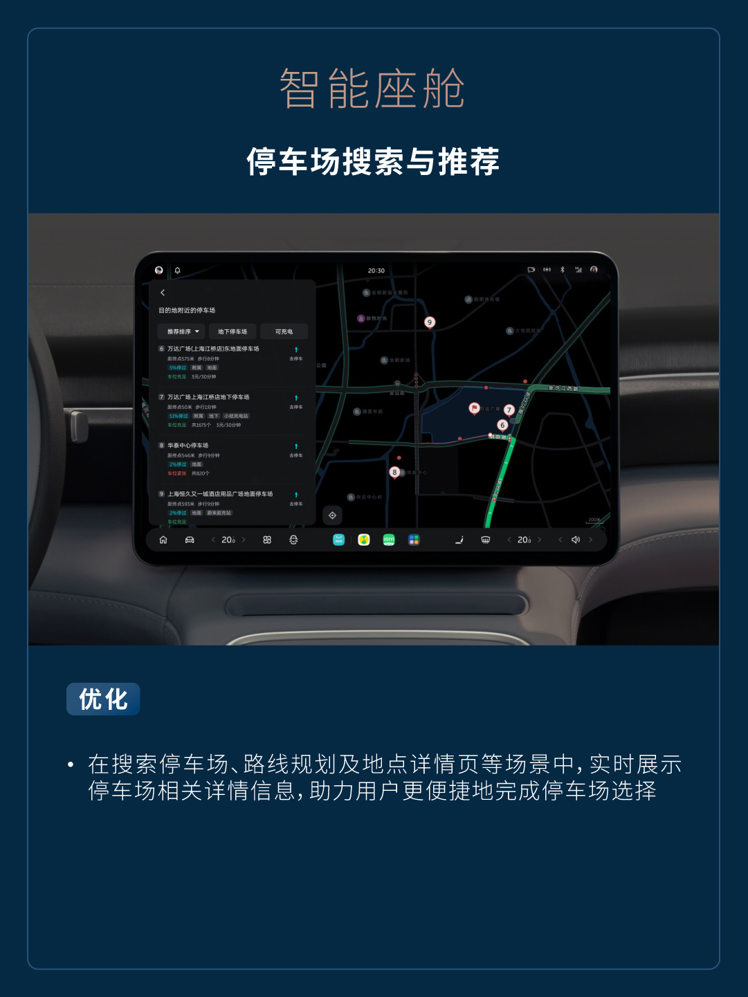 在搜索停车场、路线规划及地点详情页等场景中,实时展示停车场相关详情信息,助力用户更便捷地完成停车场选择。