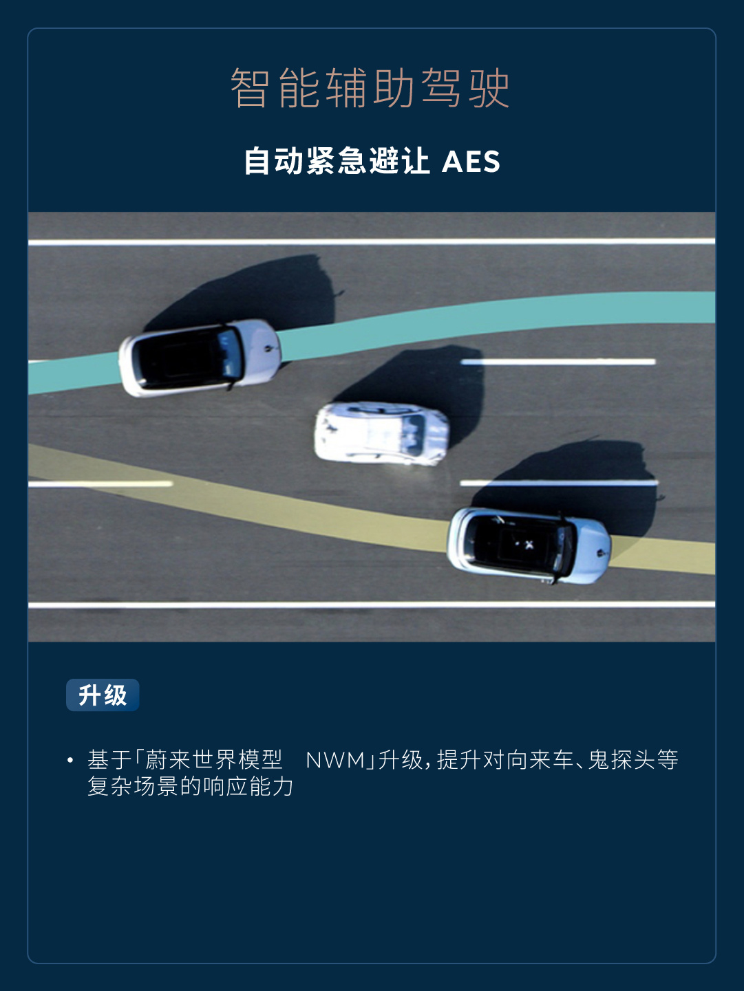 基于「蔚来世界模型 NWM」升级,提升对向来车、鬼探头等复杂场景的响应能力。