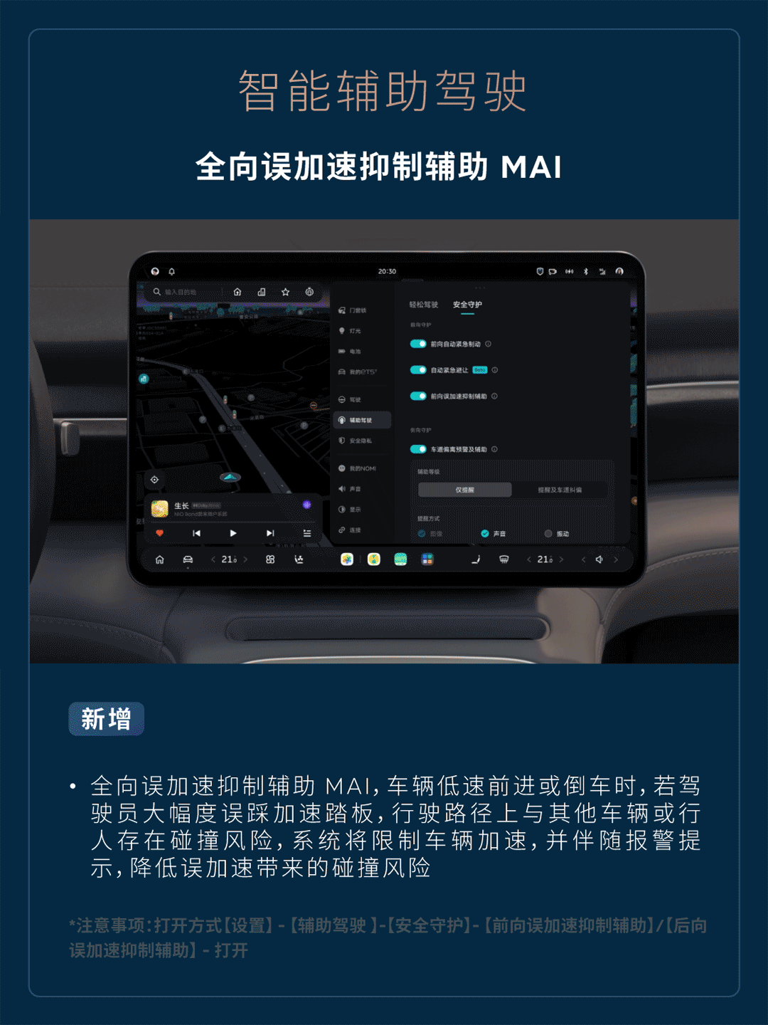 新增全向误加速抑制辅助 MAI,车辆低速前进或倒车时,若驾驶员大幅度误踩加速踏板,行驶路径上与其他车辆或行人存在碰撞风险,系统将限制车辆加速,并伴随报警提示,降低误加速带来的碰撞风险(注意事项:打开方式【设置】-【辅助驾驶】-【安全守护】-【前向误加速抑制辅助】/【后向误加速抑制辅助】-打开)。