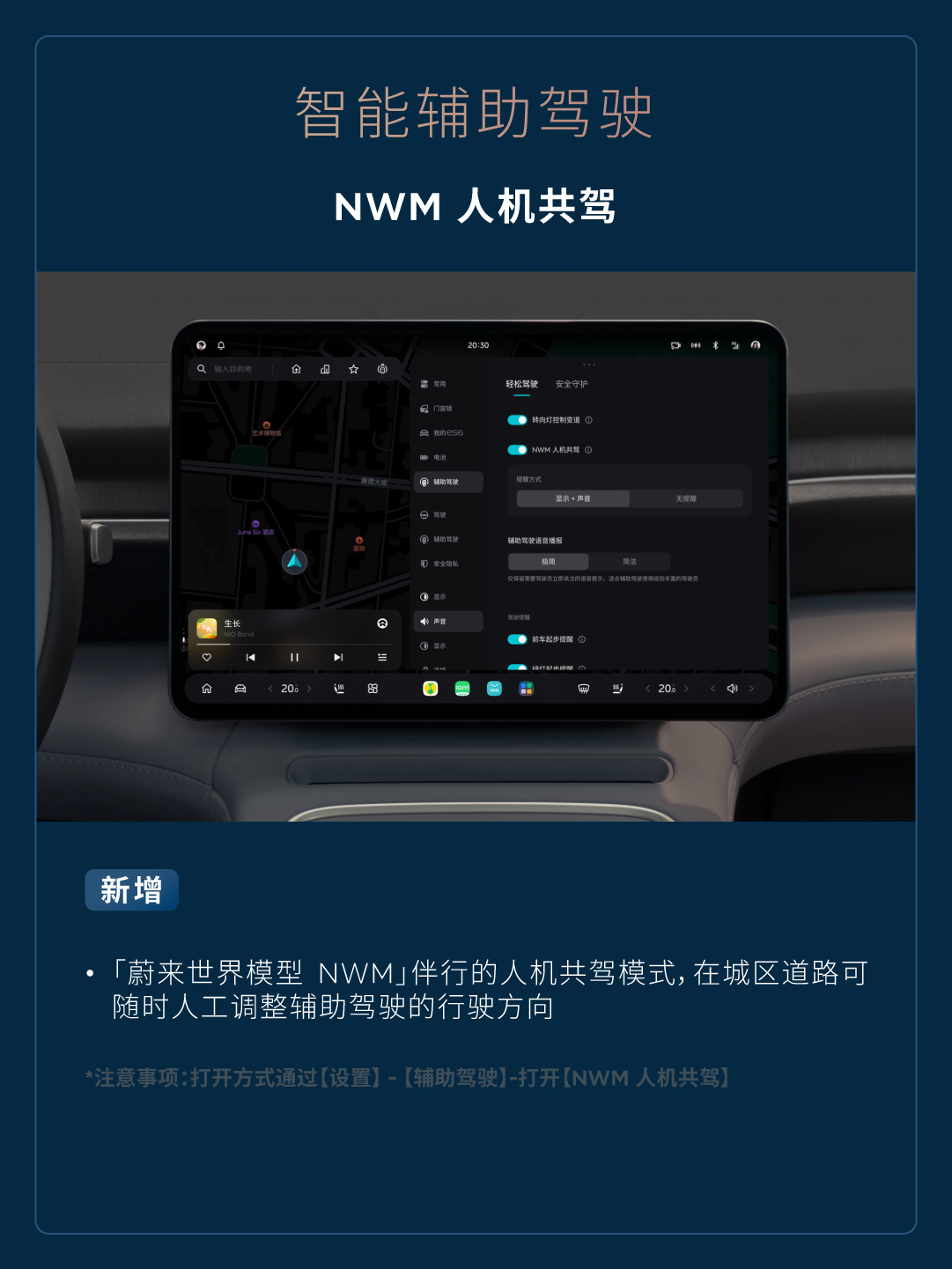 新增「蔚来世界模型 NWM」伴行的人机共驾模式,在城区道路可随时人工调整辅助驾驶的行驶方向(注意事项:打开方式通过【设置】-【辅助驾驶】- 打开【NWM 人机共驾】)。
