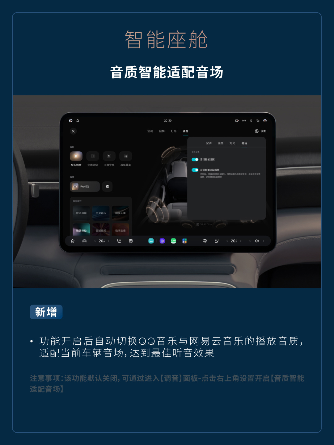 新增功能开启后自动切换 QQ 音乐与网易云音乐的播放音质,适配当前车辆音场,达到最佳听音效果(注意事项:该功能默认关闭,可通过进入【调音】面板 – 点击右上角设置开启【音质智能适配音场】)。