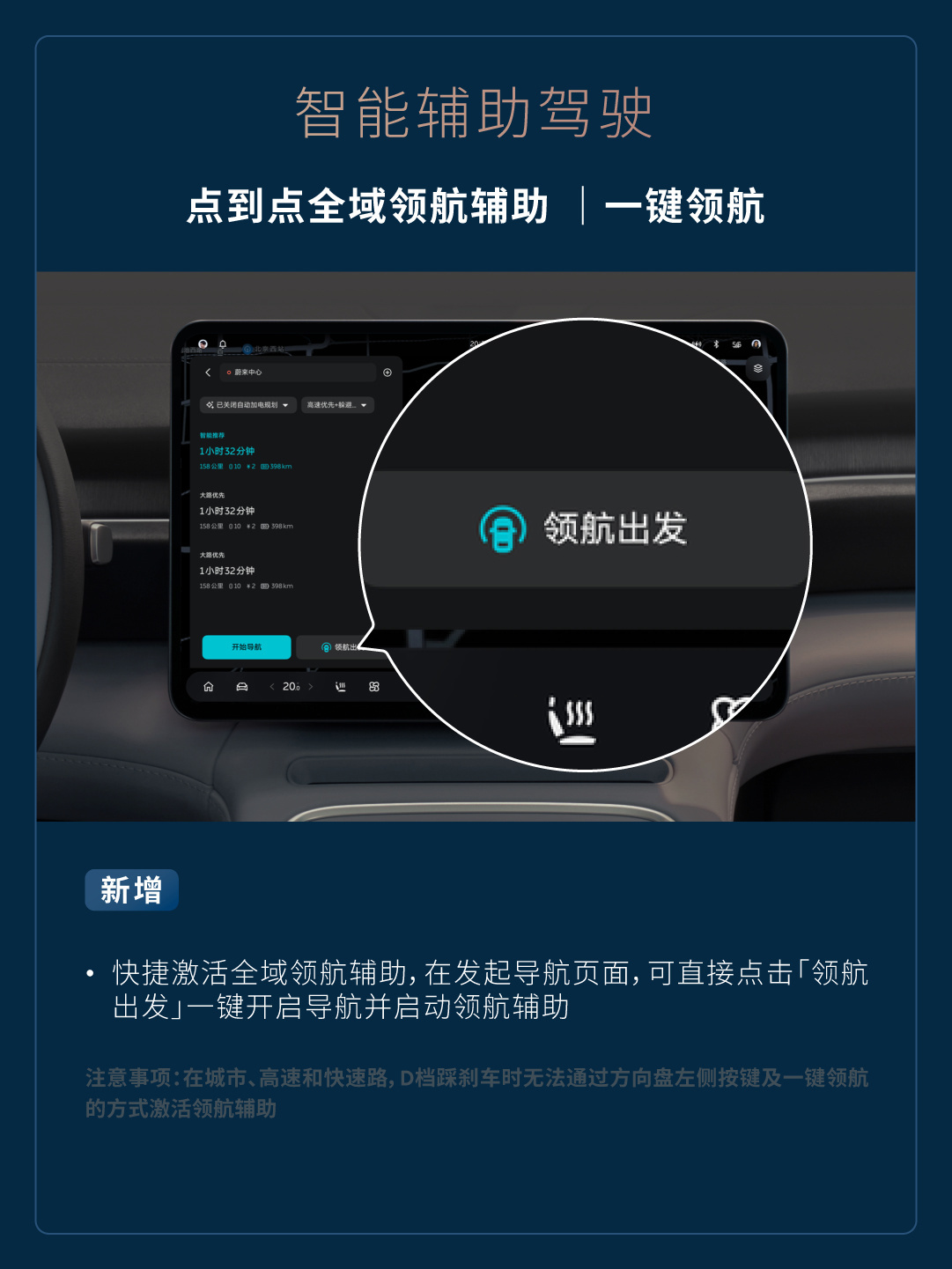 新增快捷激活全域领航辅助,在发起导航页面,可直接点击「领航出发」一键开启导航并启动领航辅助(注意事项:在城市、高速和快速路,D 档踩刹车时无法通过方向盘左侧按键及一键领航的方式激活领航辅助)。