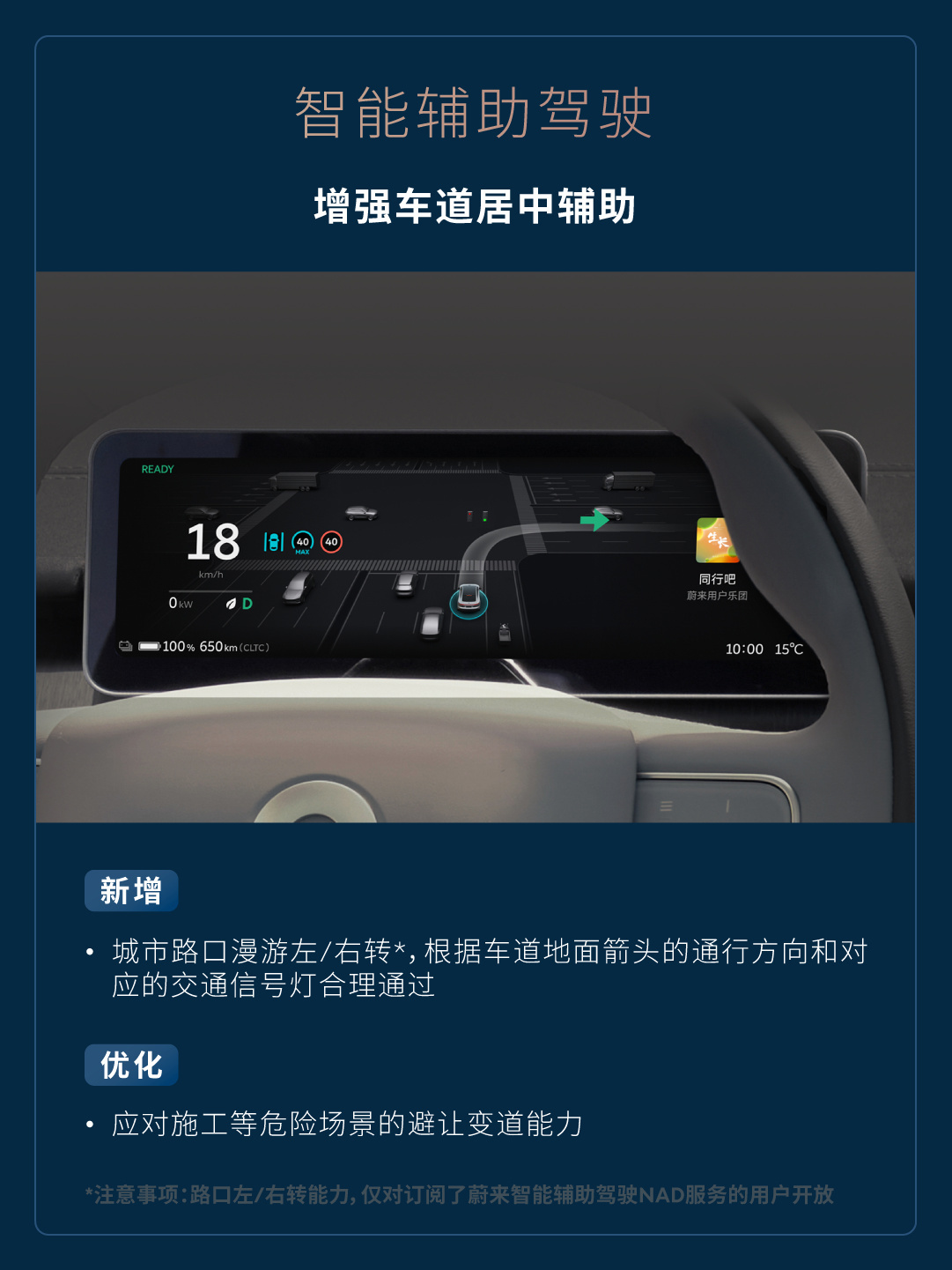 新增城市路口漫游左 / 右转,根据车道地面箭头的通行方向和对应的交通信号灯合理通过(注意事项:路口左 / 右转能力,仅对订阅了蔚来智能辅助驾驶 NAD 服务的用户开放)。