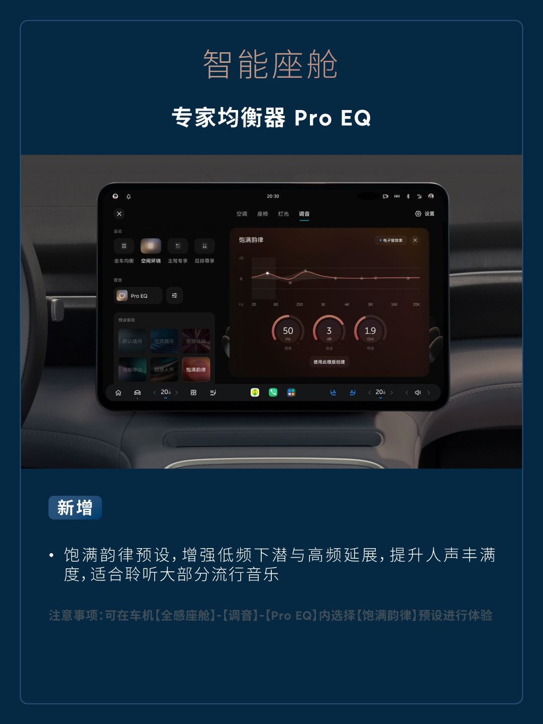 新增饱满韵律预设,增强低频下潜与高频延展,提升人声丰满度,适合聆听大部分流行音乐(注意事项:可在车机【全感座舱】-【调音】-【Pro EQ】内选择【饱满韵律】预设进行体验)。