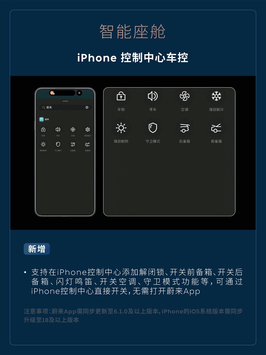 新增支持在 iPhone 控制中心添加解闭锁、开关前备箱、开关后备箱、闪灯鸣笛、开关空调、守卫模式功能等,可通过 iPhone 控制中心直接开关,无需打开蔚来 App(注意事项:蔚来 App 需同步更新至 6.1.0 及以上版本,iPhone 的 iOS 系统版本需同步升级至 18 及以上版本)。
