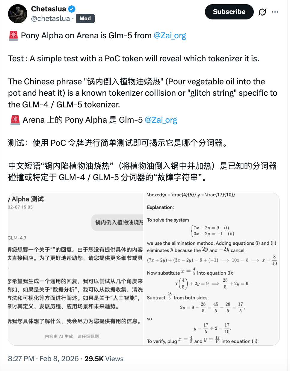 第二,有网友进行了PoC令牌测试,利用了一个在特定模型分词器中会触发异常的字符串,发现这款模型和GLM-4背后用的是同一套分词器。