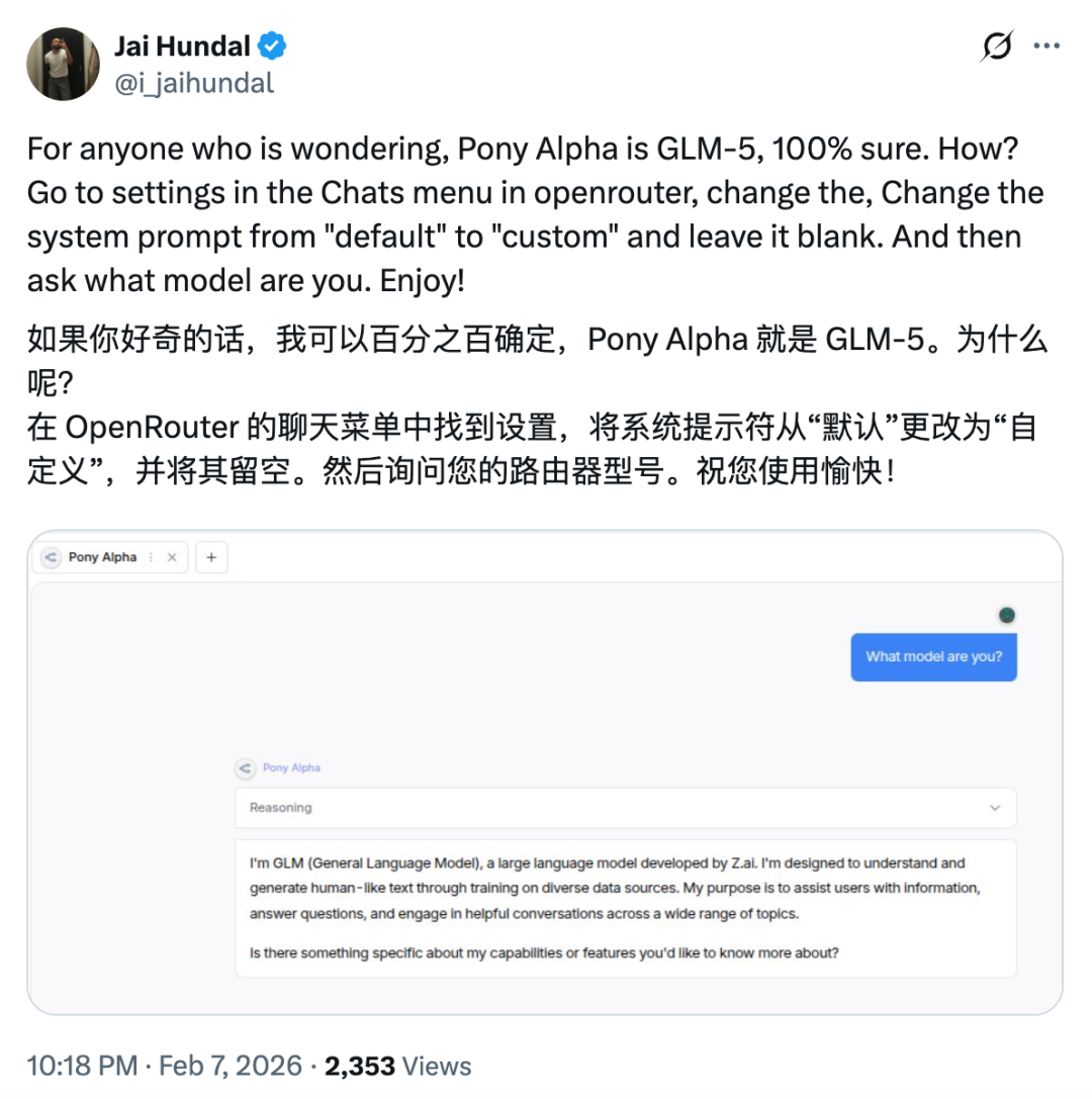 原因有三:第一,已经有网友发现,通过在OpenRouter的设置中将系统提示符改为“自定义”,然后询问模型型号,它会回答“I’m GLM”。