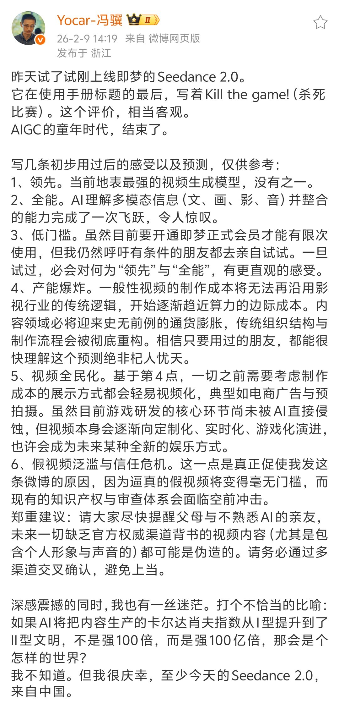 游戏科学CEO冯骥评价Seedance 2.0:令人惊叹 庆幸这项技术来自中国 凤凰网科技讯 2月9日,游戏科学CEO冯骥对字节Seedance 2.0评价称:“AI理解多模态信息并整合的能力完成了一次飞跃,令人惊叹。” 他表示,一般性视频的制作成本将无法再沿用影视行业的传统逻辑,开始逐渐趋近算力的边际成本。内容领域必将迎来史无前例的通货膨胀,传统组织结构与制作流程会被彻底重构。此外,冯骥针对“假视频泛滥与信任危机”作出提醒,“我很庆幸,至少今天的Seedance 2.0,来自中国。”他表示。 Published by 风君子 独自遨游何稽首 揭天掀地慰生平 View all posts by 风君子