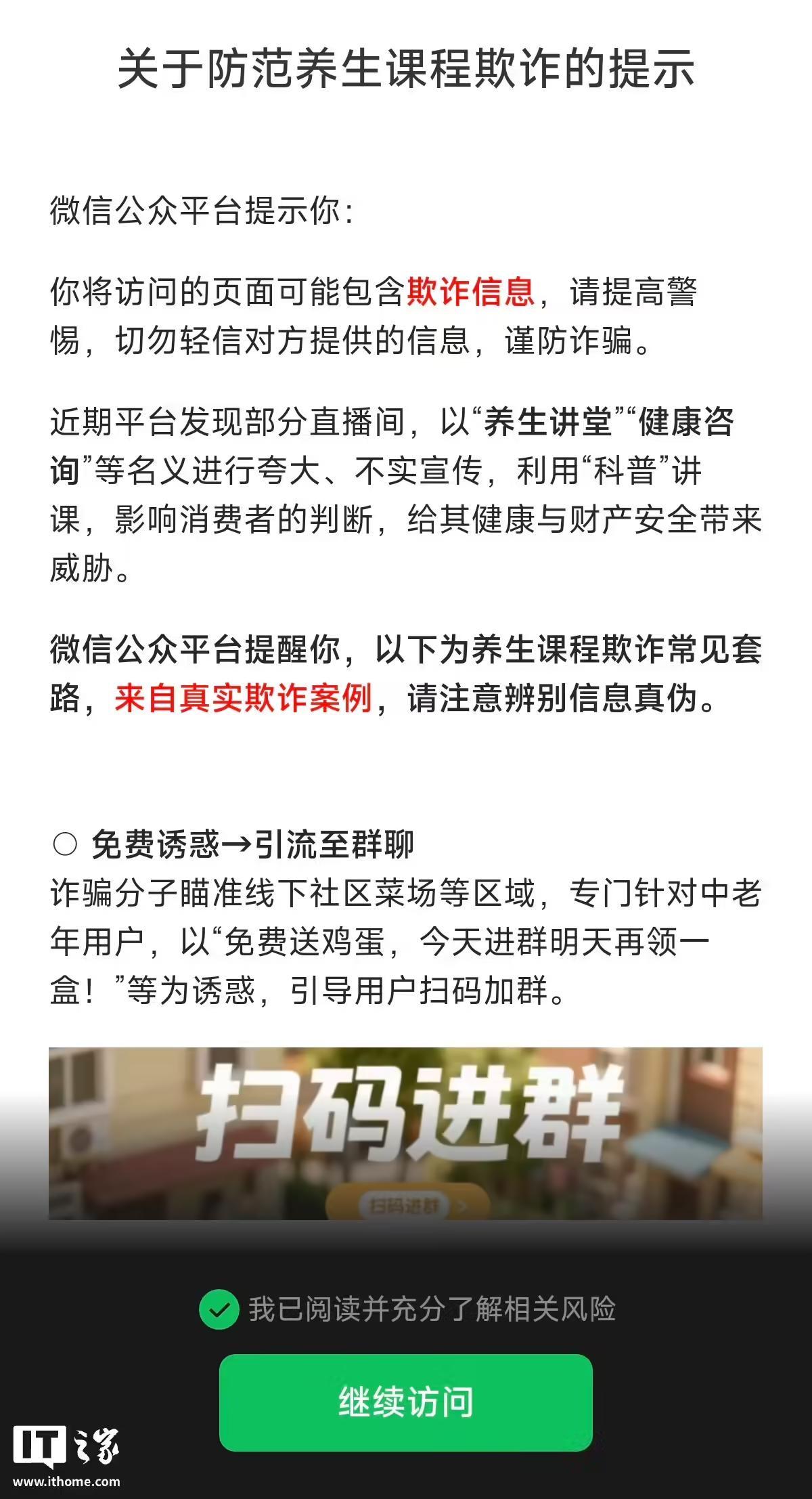 IT之家实测后发现,弹窗中显示该小程序“近期被大量用户投诉,可能存在欺诈行为”,重点色按钮为“停止访问”,若尝试点击“继续”按钮使用小程序的话,则会被带到“关于防范养生课程欺诈的提示”网页,再次提醒用户访问的页面可能包含欺诈信息。