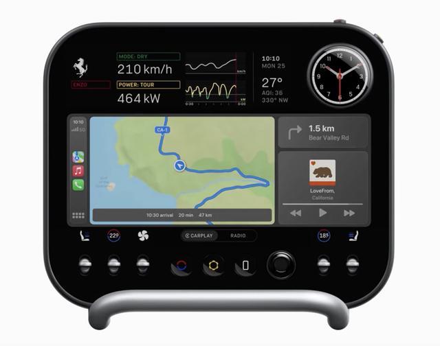 这辆车的中控屏幕则是带有球形转轴,可以自由朝向驾驶员 / 副驾驶,配备掌托,不需要低头就能操作,右侧带有球形多功能表,可切换时钟、计时器、指南针和弹射起步指南等,顶部左侧的第二块屏幕则用于显示时速、功率等高级参数,中部大屏可显示 CarPlay、空调和参数设置等信息。