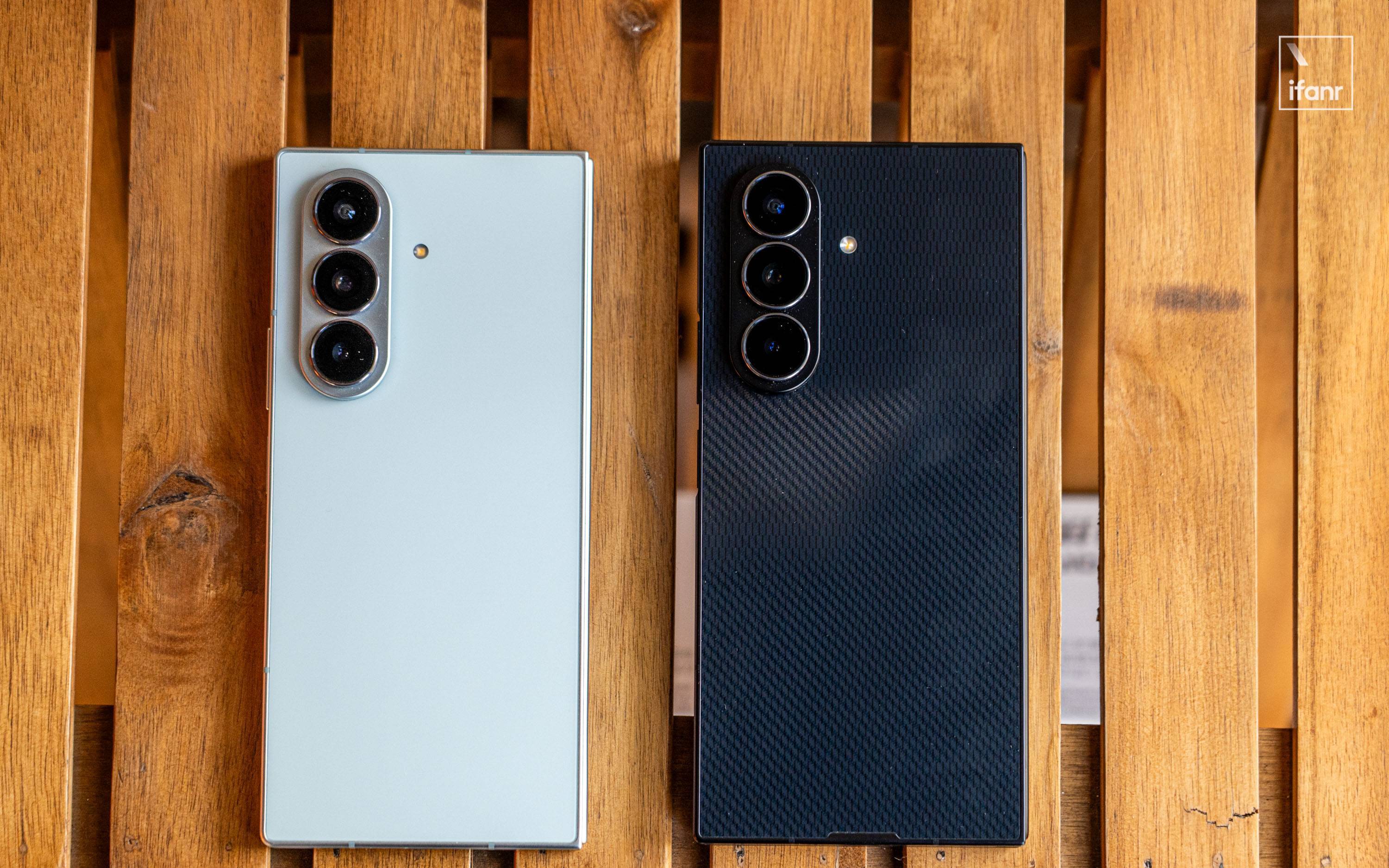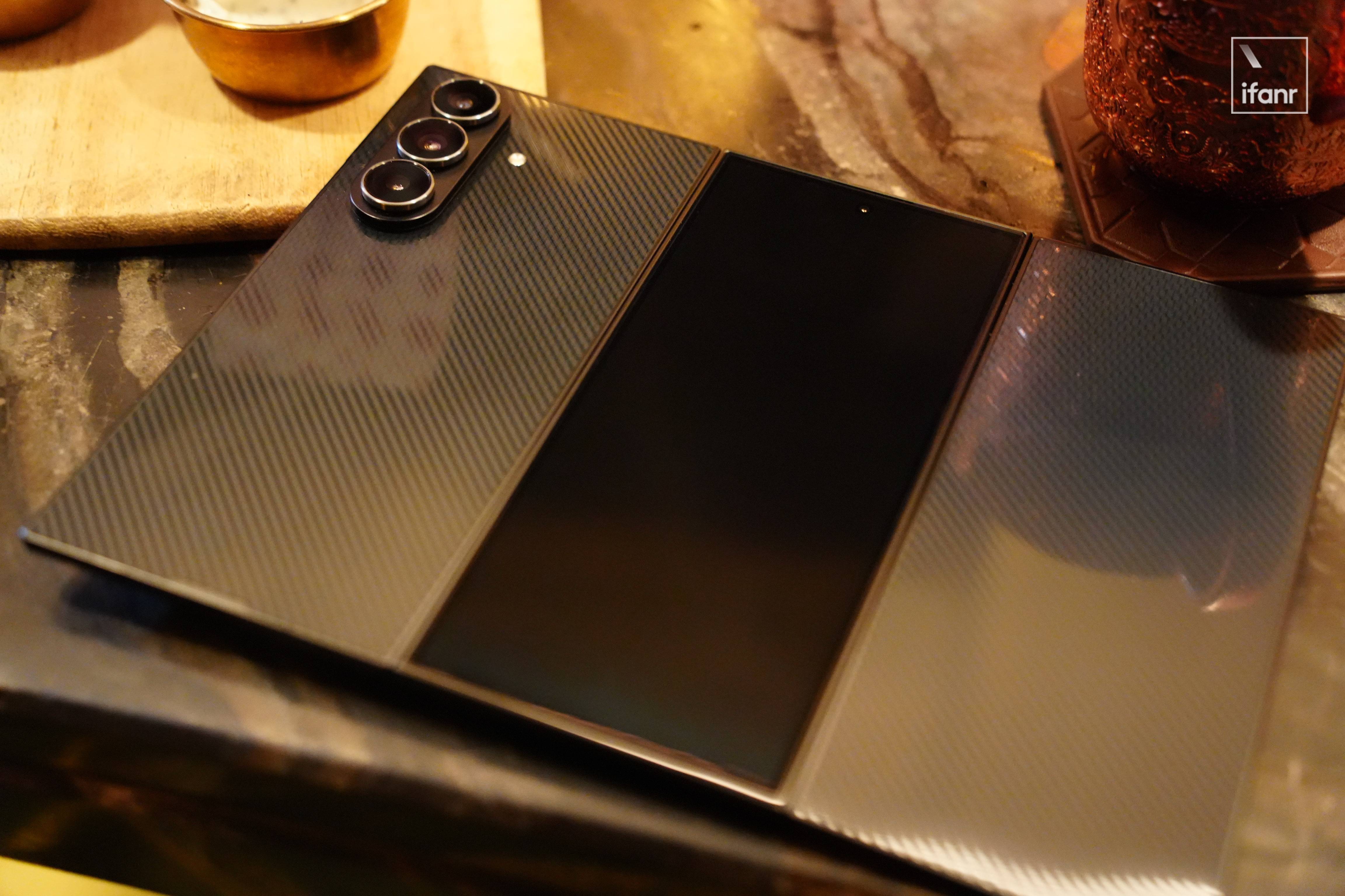 无论是这个拥有碳纤维纹理的「聚合物」背板,还是为了方便翻开而特意加宽的第三段机身,都和市面上其他折叠手机的设计有着非常不同的取向。