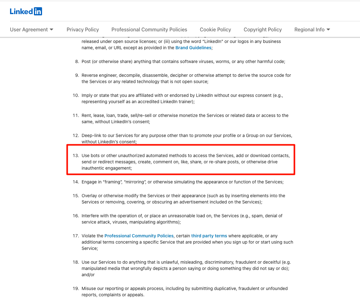 让 Siri 去 LinkedIn 上发一个求职申请?来着了,LinkedIn 是是全球对自动化打击最严厉的平台之一,《用户协议》第 8.2 条明确禁止了一系列自动化操作。