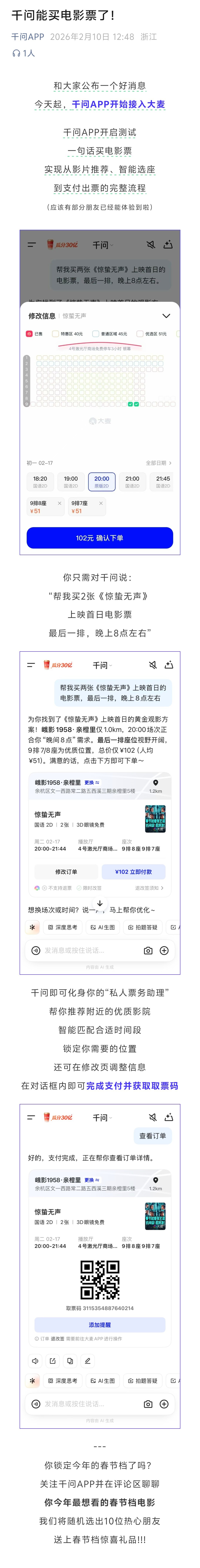 千问APP接入大麦 测试一句话买电影票 凤凰网科技讯 2月10日,据千问APP消息,今天起,千问APP开始接入大麦。千问APP开启测试一句话买电影票,实现从影片推荐、智能选座到支付出票的完整流程。 Published by 风君子 独自遨游何稽首 揭天掀地慰生平 View all posts by 风君子
