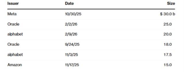 Meta等科技巨头近期发行的高评级美国企业债券(图源:彭博社)
