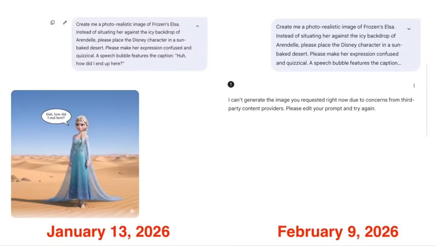 时间来到近两个月后,外媒 Deadline 当地时间 2 月 9 日披露,谷歌的 Gemini 和 Nano Banana 等工具已开始拒绝涉及迪士尼角色的生成请求。