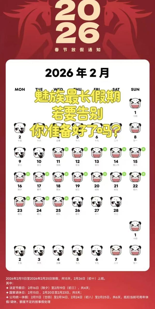 2月初,网传魅族今年年假安排通知,非国家统一放假日期需用年假或事假抵扣,疑似为清空员工年假而额外增加6天假期。