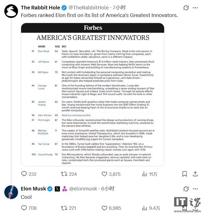 IT之家注意到,一位网友在 X 上分享了这份榜单前十的截图,马斯克对此回应称:“酷”。