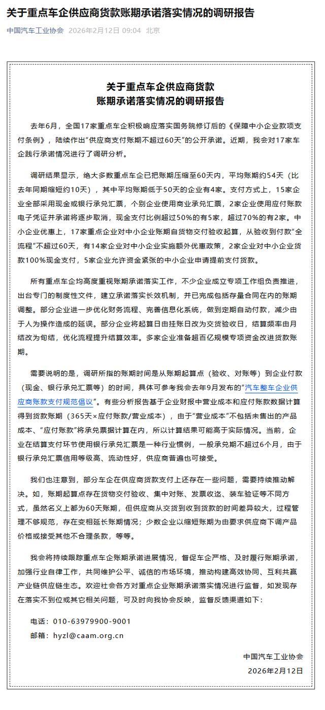 IT之家 2 月 12 日消息,今日,中国汽车工业协会发布关于重点车企供应商货款账期承诺落实情况的调研报告。调研结果显示,绝大多数重点车企已把账期压缩至 60 天内,平均账期约 54 天(比去年同期缩短约 10 天),其中平均账期低于 50 天的企业有 4 家。
