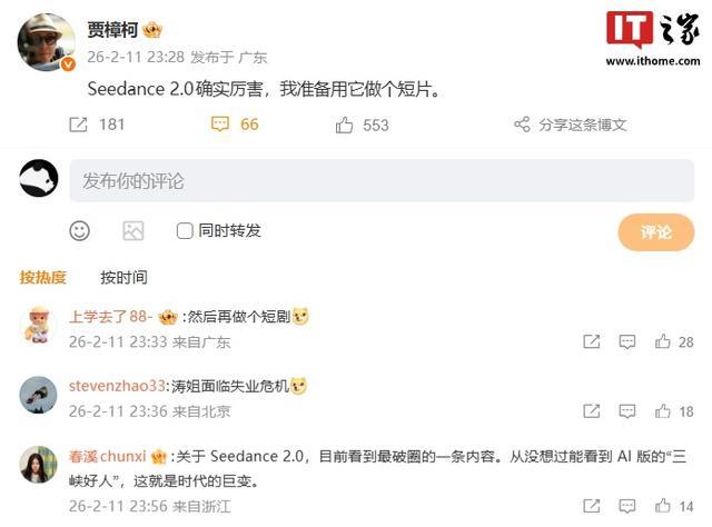 IT之家 2 月 12 日消息,电影导演贾樟柯昨晚公开发文感叹字节跳动 Seedance 2.0“确实厉害”,他表示自己准备用它做个短片。