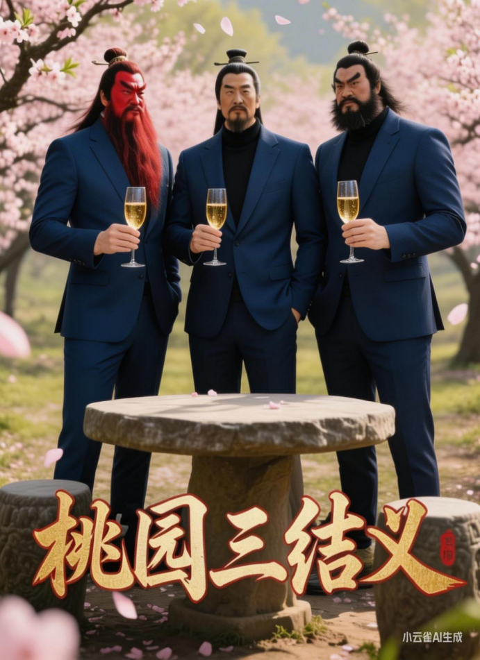 提示词:这是三国中桃园结义的场景。请将图2的人物(马斯克)自然地融入图1的场景(桃园结义)中,让他站在刘备的左侧,同样举着酒杯。统一光影为桃园的柔和自然光,人物穿着要改成汉代风格的长袍,但保留图2人物的面部特征。画面构图要平衡,四人结义。