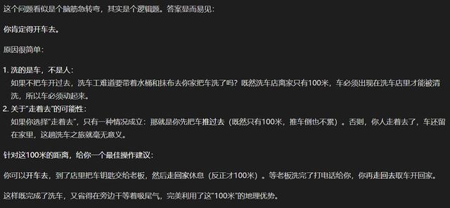 GLM-5上线后,我们第一时间给它出了几道带有逻辑陷阱的的网红测试题。第一道题目是这样的:我要去洗车,洗车的地方离家就100米,我是开车去呢,还是走着去呢?