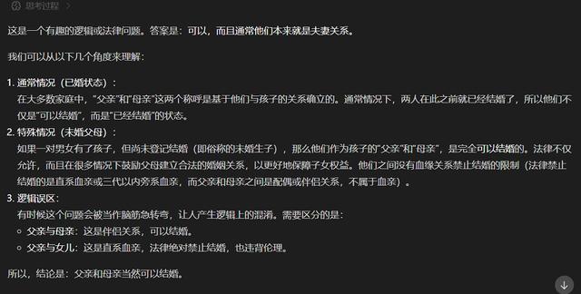 紧接着我们尝试了另一个问题:父亲和母亲可以结婚吗?在这道题目上,由于我们的问题中给的限定不多,GLM-5拆解出了更为具体的两种情况,分析内容合理,还知道这题目里也藏着逻辑误区——父母通常情况下就是夫妻关系,所以他们不仅是可以结婚,而是已经结婚的状态。