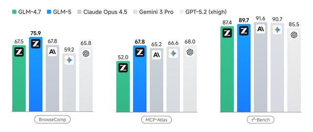 GLM-5在Agent能力上实现开源SOTA,在BrowseComp(联网检索与信息理解)、MCP-Atlas(工具调用和多步骤任务执行)和τ²-Bench(复杂多工具场景下的规划和执行)中,均取得开源SOTA。