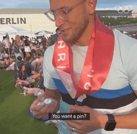 在运动员们居住的奥运村,有着百年历史的交换徽章(Pin)传统,约等于我们小时候交换干脆面卡片、二次元去漫展换谷子,是最高级别的社交礼仪。小小一枚徽章,就是参赛选手最好的伴手礼。