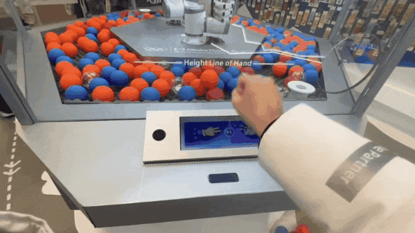 想体验一把「隔空取物」?那就站在屏幕前抬手,玻璃后的机械手会准确 copy 你的每一个手部动作,你指哪,它去哪;看准了,手一握,就伸入徽章球池给你捞一个新徽章球回来。