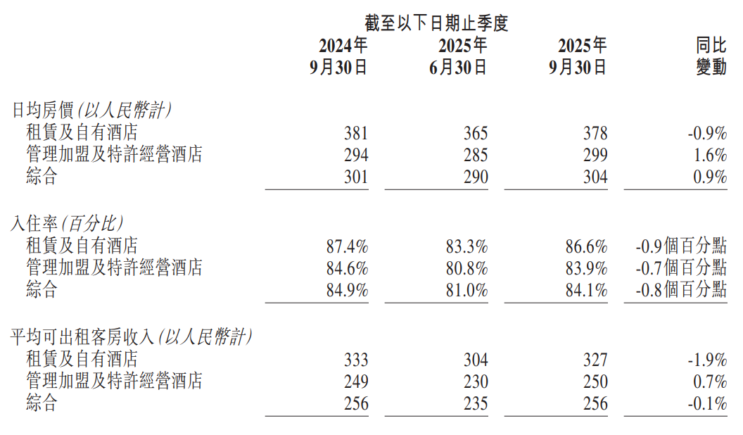 2025年前三季度,华住集团自有酒店的日均房价为378元,加盟酒店仅为299元;自有酒店入住率为86.6%,加盟酒店为83.9%;自有酒店平均可出租客房收入为327元,加盟酒店仅为250元。