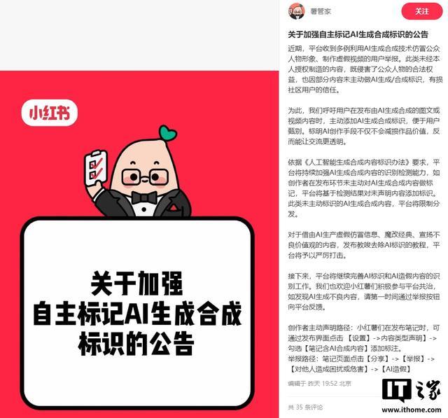IT之家 2 月 13 日消息,小红书薯管家昨日发布公告,呼吁站内用户对 AI 生成合成内容进行主动标识。