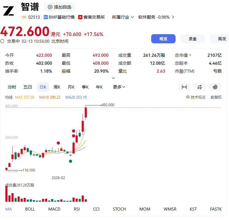 IT之家 2 月 13 日消息,今日早盘,智谱港股盘初快速拉升,盘中最高涨超 22%,再创上市以来新高,达到 492 港元。截至IT之家发稿,智谱股价回落至 472.6 港元,总市值超 2100 亿港元(IT之家注:现汇率约合 1856.6 亿元人民币)。