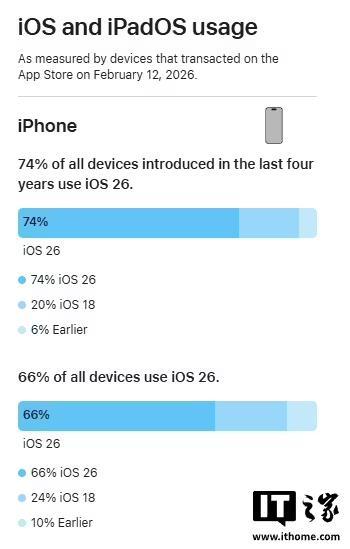 从 iPhone 端来看,过去四年内推出的 iPhone 中有 74% 已升级至 iOS 26;如果统计全部 iPhone 设备,则有 66% 正在运行 iOS 26。
