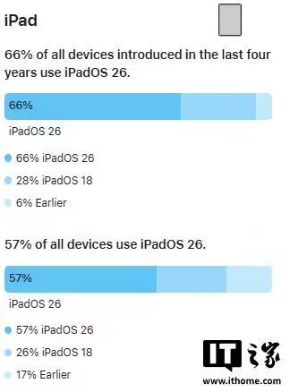 在 iPad 端,过去四年内推出的 iPad 中有 66% 运行 iPadOS 26;如果统计全部 iPad 设备,则有 57% 已升级至 iPadOS 26。