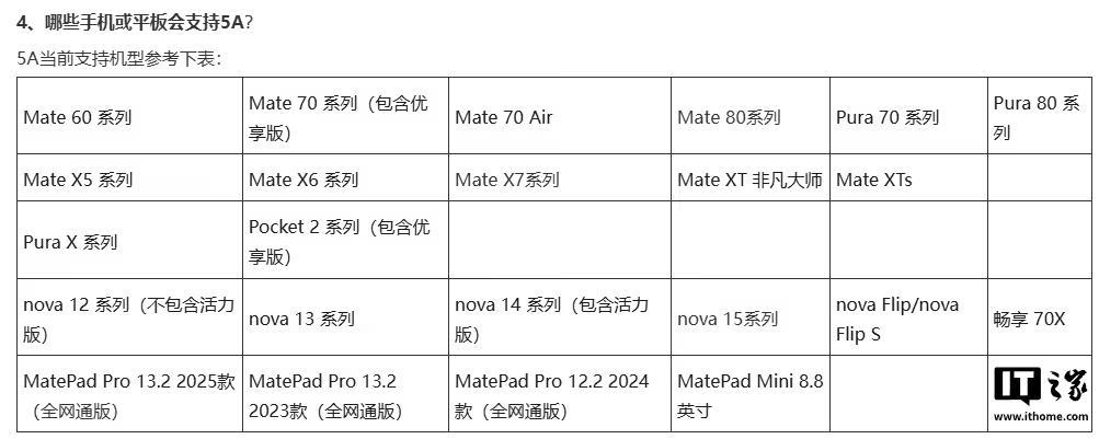 IT之家 2 月 14 日消息,华为官网悄悄更新了 5A 相关问题的支持文档,公布了支持 5A 技术的详细机型清单,涵盖手机及平板产品线,包括畅享 70X 等一系列机型均有涉及。